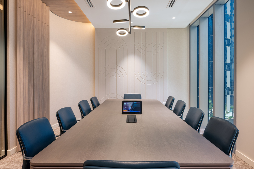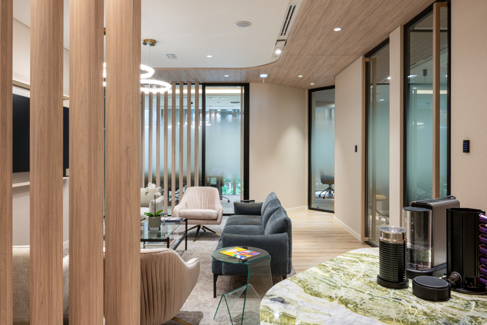 Clean lines and curved forms define the design language, while accent lighting and custom joinery add depth and visual rhythm. The meeting areas and executive zones are framed in warm wood tones, complemented by plush textures and subtle geometric details that lend a sense of timeless modernity.